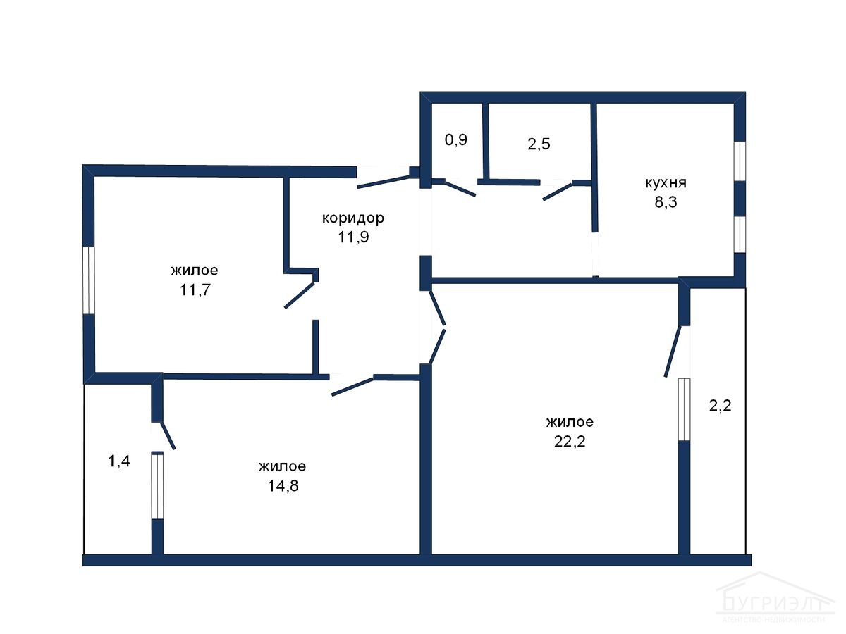 Общая площадь квартиры с лоджией составляет - 75,3 м2, жилая площадь - 48,1 м2, кухня - 8,3 м2. Удобная планировка: большая гостиная с выходом на лоджию - 22,2 м2, жилая комната с выходом на лоджию - 14,2 м2 и жилая комната - 11,7 м2, кухня - 8,3 м2, раздельный санузел, прихожая - 11,9 м2. Высота потолков - 2,5 метра.