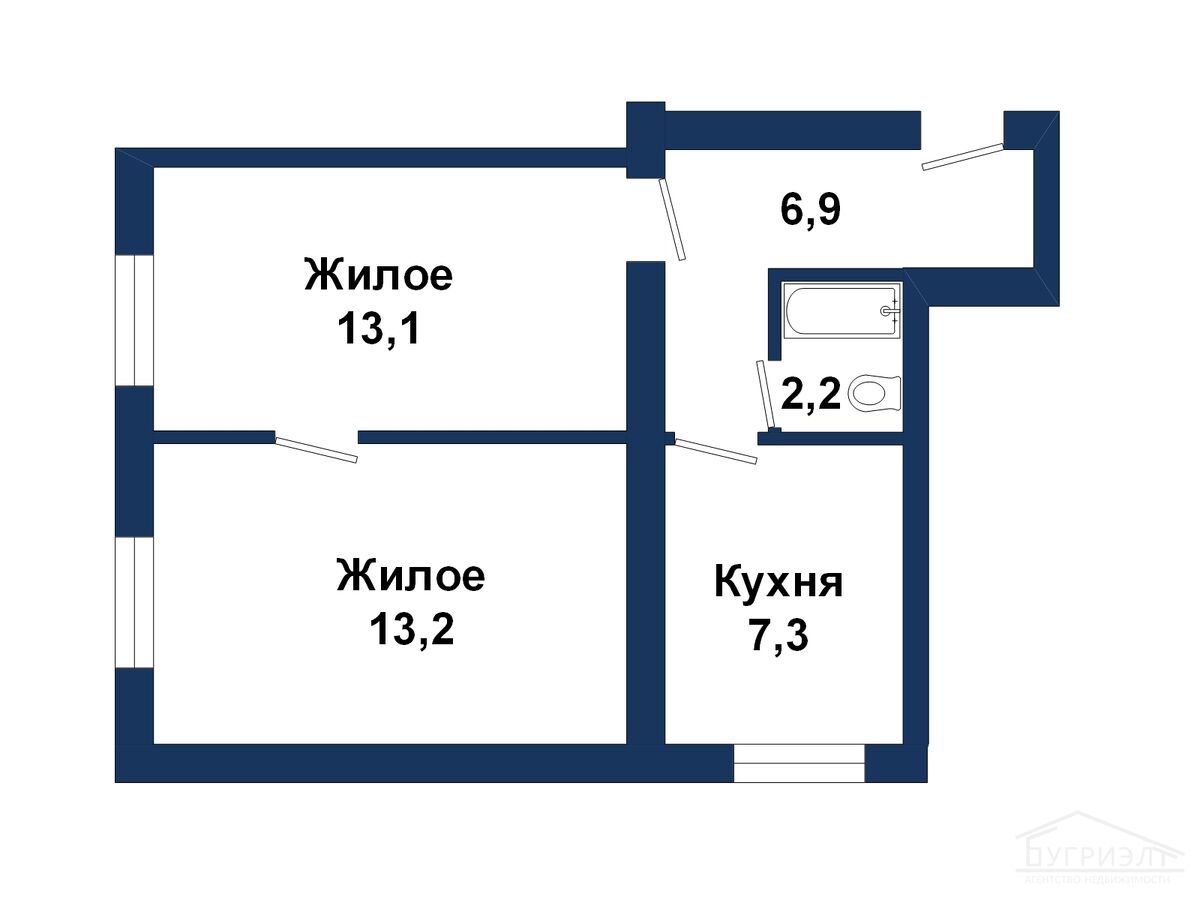 Функциональная планировка: светлая гостиная - 13.1 м2, спальня - 13,2 м2, кухня - 7,3 м2, коридор - 6,9 м2, совмещенный санузел. Высокие потолки (3м) - добавляют ощущение простора.